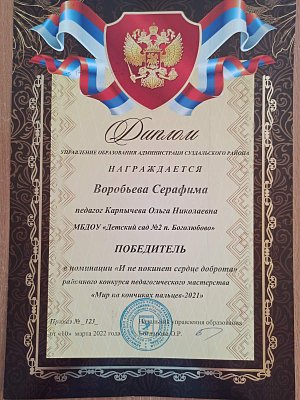 Диплом победителя муниципального конкурса "Мир на кончиках пальцев" в номинации "И не покинет сердце доброта".