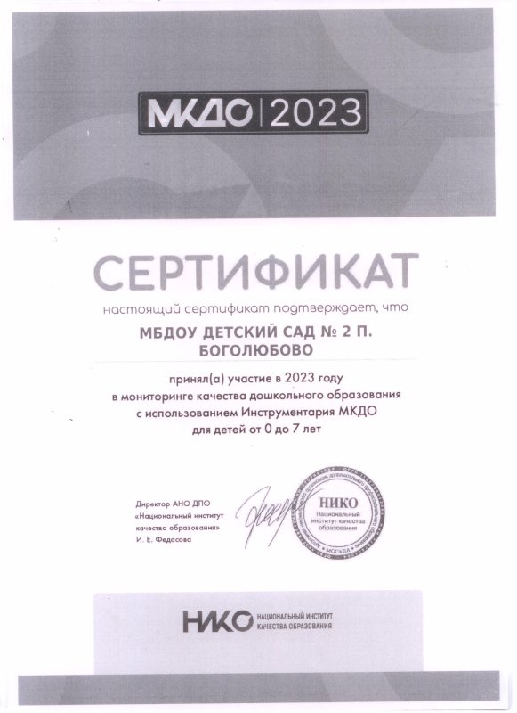 Сертификат участия в Мониторинге качества дошкольного образования с использованием Инструментария МКДО